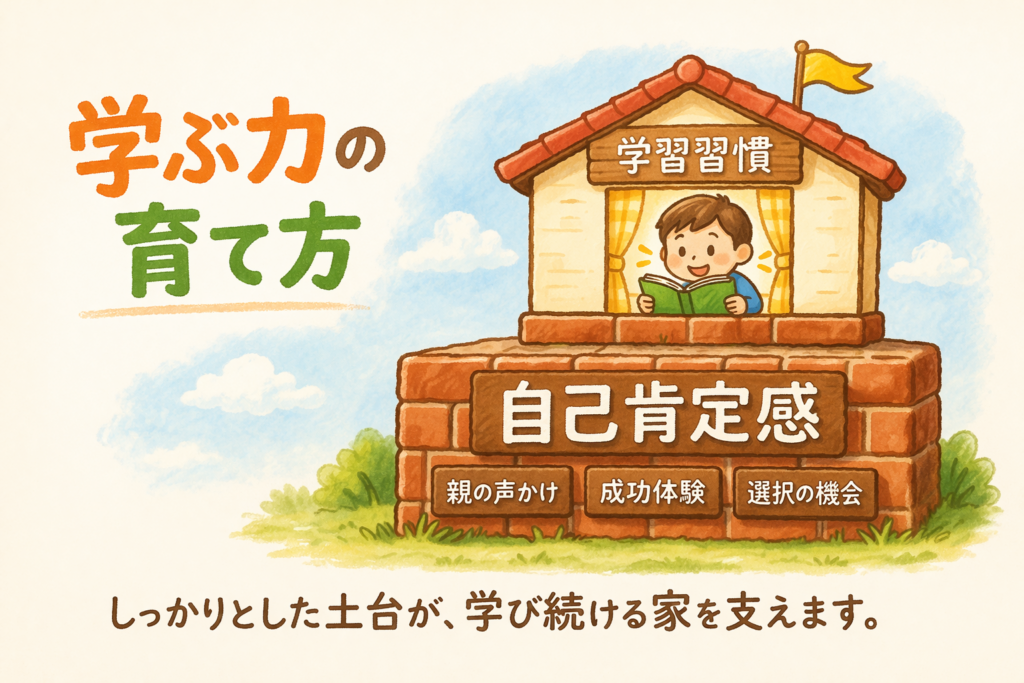 参考altテキスト: 自己肯定感という土台の上に学習習慣という家が建っているイラスト。学ぶ力の育て方を示している。