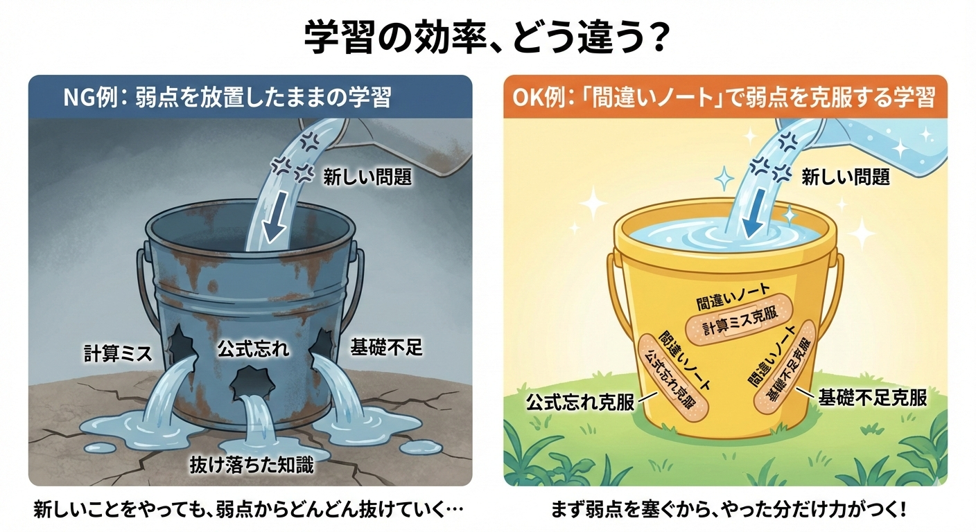 今の君が新しい問題集に手を出すのは、穴の空いたバケツに必死で水を注いでいるようなもの。まずはその「穴(=弱点)」がどこにあるのかを正確に見つけて、一つひとつ丁寧に塞いでいく作業が何よりも重要なんだ。