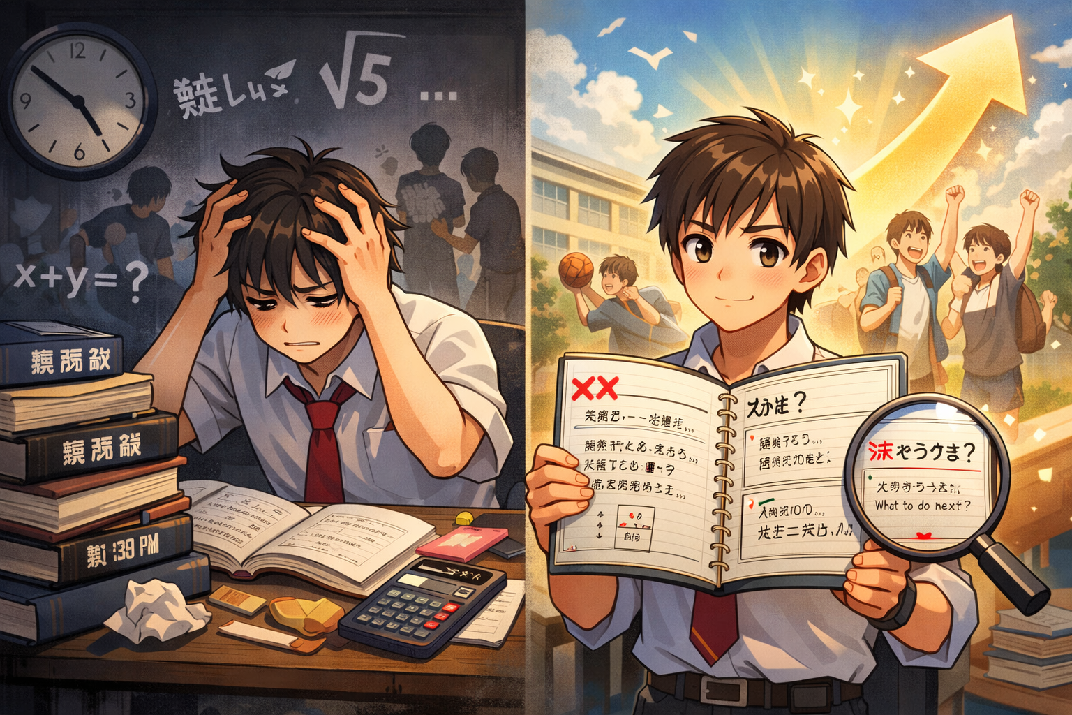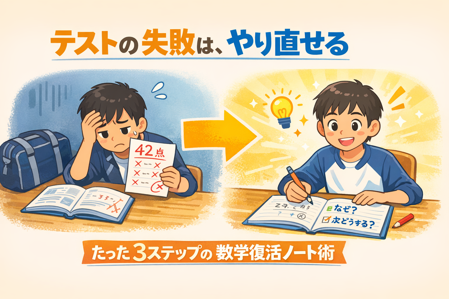 でも、今日、ノートを開いて、間違えた問題を1問だけ写してみる。それだけで、君の未来はもう確実に変わり始めているんだ。その小さな一歩が、次のテストでの大きな自信に繋がっている。