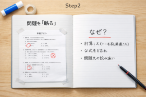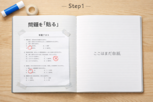 なぜなら、このステップで一番大事なのは「完璧にやること」ではなく「とにかく始めること」だからです。多くの生徒が「ノートを綺麗に作らなきゃ」と思ってしまい、そこで手が止まってしまいます。まずは一番楽な方法で、最初の1問をノートに貼り付けることから始めましょう。